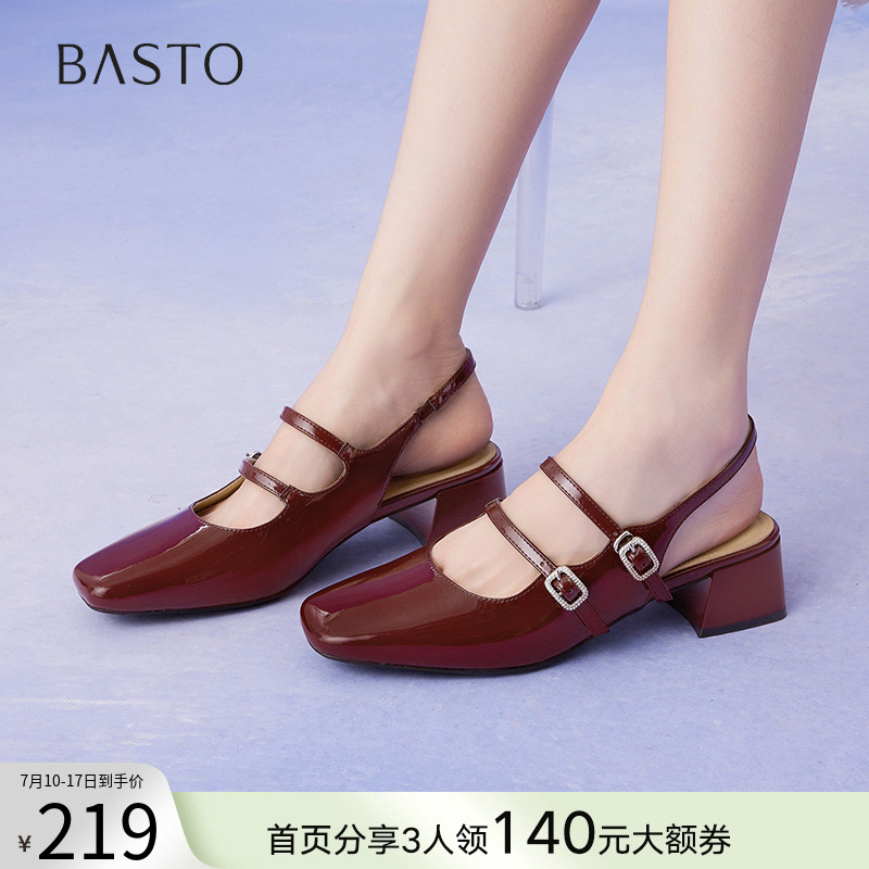 百思圖2025夏季新款時尚通勤方頭粗跟瑪麗珍后空女涼鞋F5161BH5