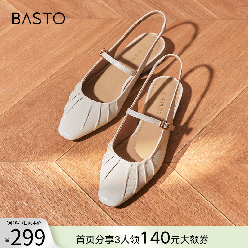 百思圖夏商場新款氣質舒適褶皺尖頭后空女瑪麗珍涼鞋TSQ09BH4