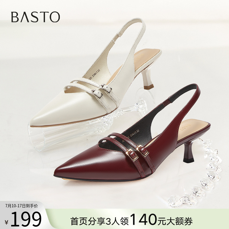 百思圖25夏商場新款通勤牛皮尖頭細跟后空女瑪麗珍涼鞋AC825BH5