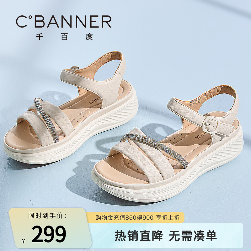 千百度時裝涼鞋女2025夏季新款時尚百搭一字式水鉆休閑外穿涼鞋