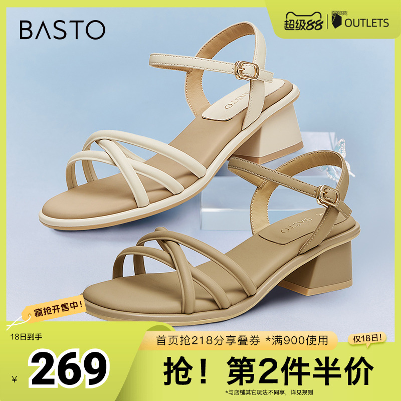 百思圖春夏季新款商場同款時尚簡約一字帶粗跟女涼鞋TS501BL4