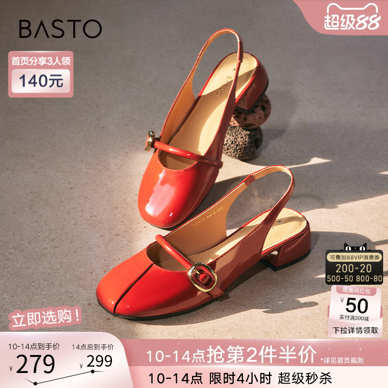 百思圖夏商場新款舒適粗跟包頭后空女法式瑪麗珍涼鞋RD293BH4