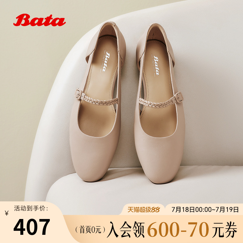 Bata中空涼鞋女2025夏季商場新款羊皮一字帶軟底瑪麗珍AYU13BK5