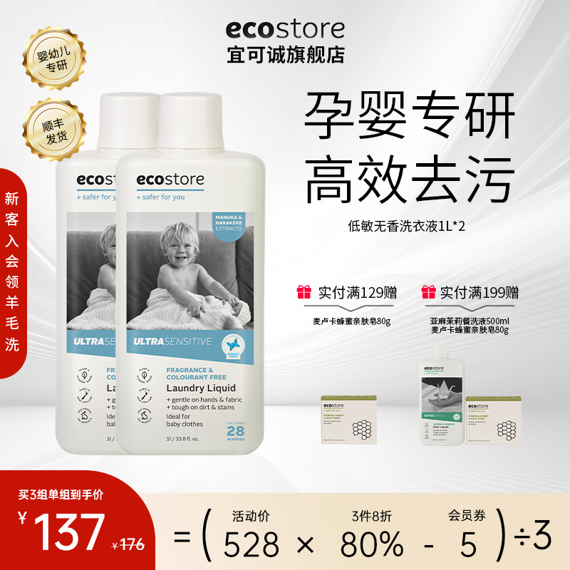 ecostore宜可誠嬰兒洗衣液寶寶內衣褲專用兒童孕婦低敏無香1L*2瓶