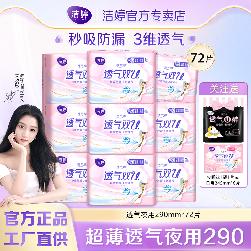 潔婷衛生巾透氣雙U夜用290棉柔超薄親膚姨媽巾關曉彤同款正品整箱