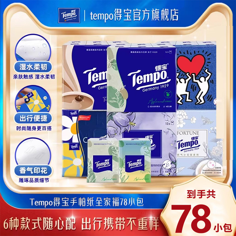 Tempo得寶手帕紙4層加厚7張78包便攜式紙巾全家福紙巾濕水柔韌紙