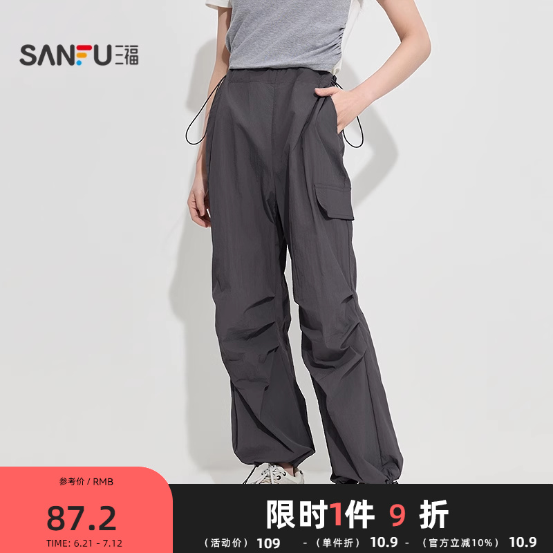 三福女夏季梭織工裝褲單褲 抽繩高腰可調節腳口休閑長褲498049
