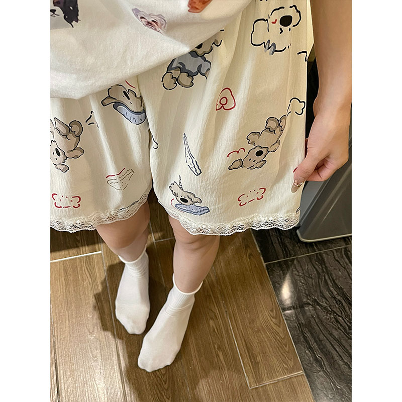 夏季睡衣女純棉寬松云朵棉蕾絲花邊睡褲三分褲短褲女家居褲可外穿