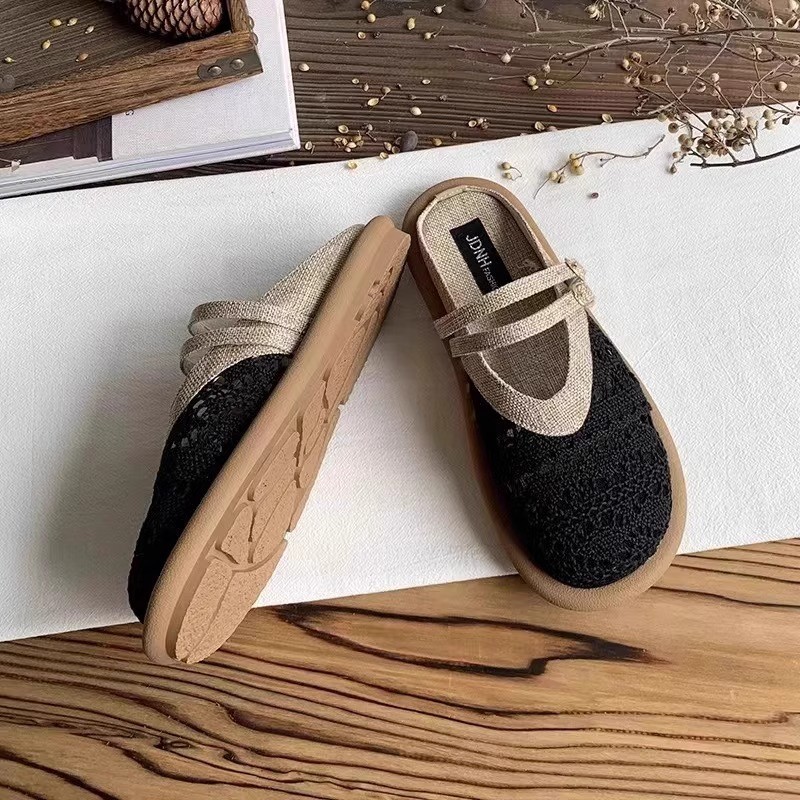 推薦亞麻包頭半拖鞋女外穿蕾絲透氣2025夏季新款輕便一腳蹬漁夫勃