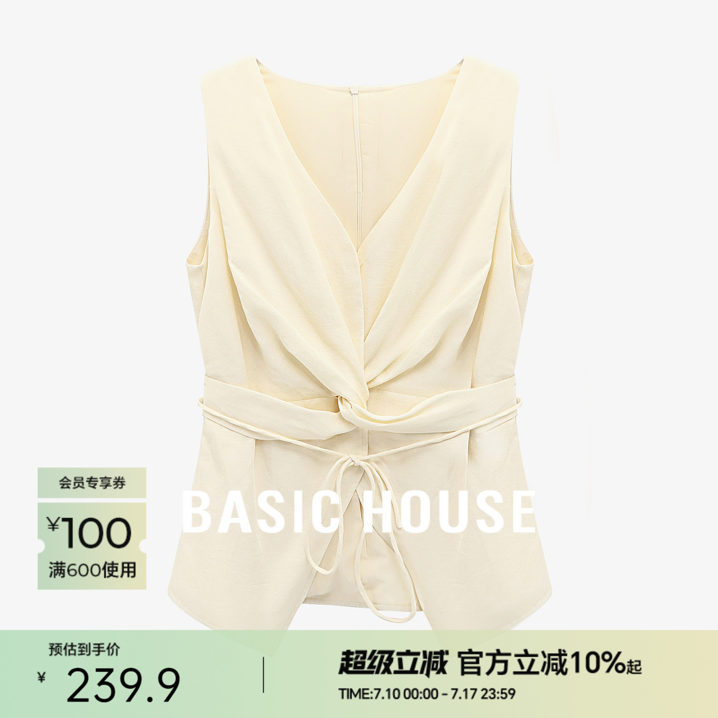 Basic House/百家好交叉褶皺V領無袖上衣夏季新款簡約時尚馬甲女
