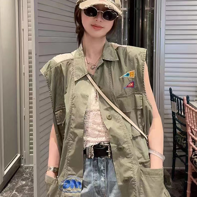 歐洲站2025夏季新款時尚V領無袖單排扣復古做舊工裝牛仔馬甲坎肩