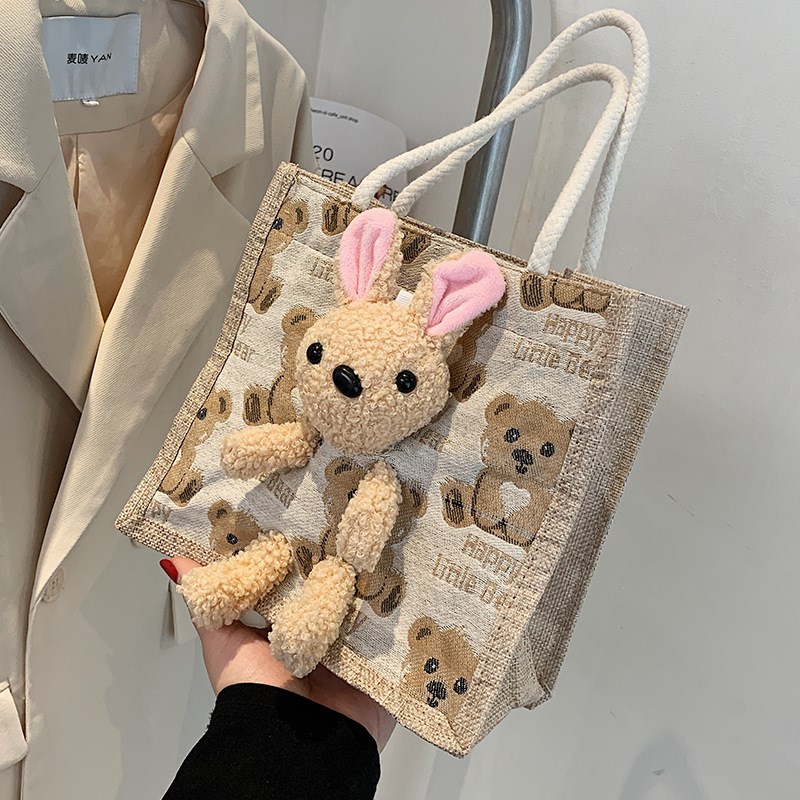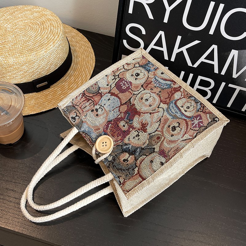 現貨亞麻手提包m麻布袋學生手拎外出飯盒包可愛卡通帆布小挎包