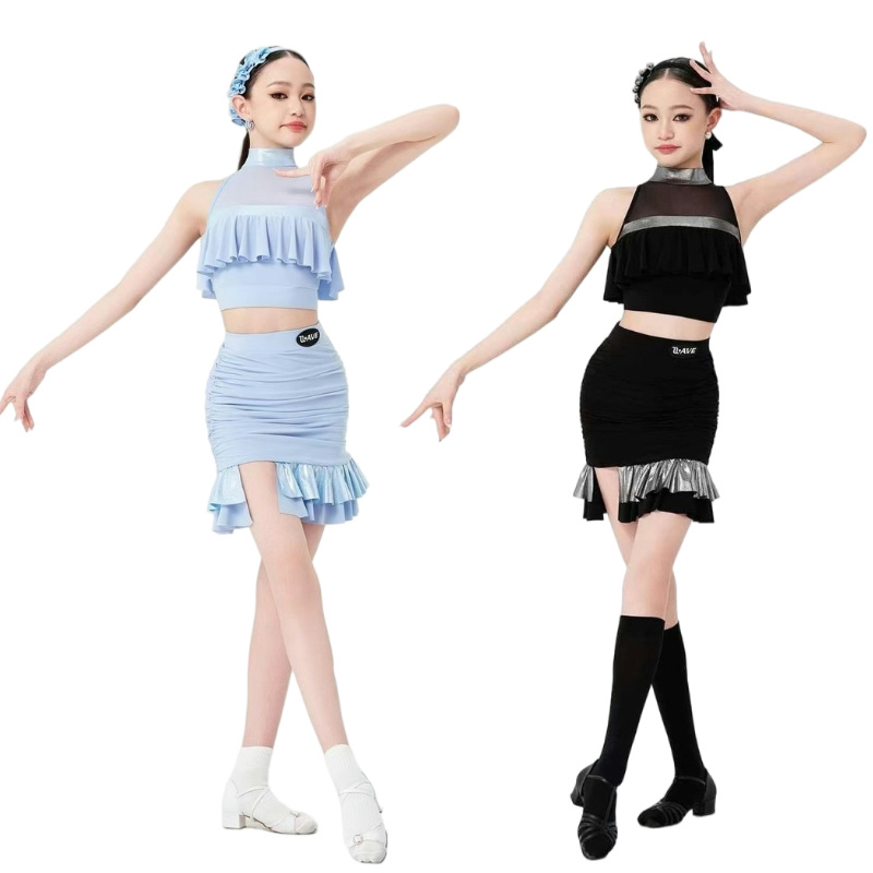 Tiomi舞服少兒拉丁舞風帆舞蹈春夏包臀吊帶藍色荷葉邊套裝練習服