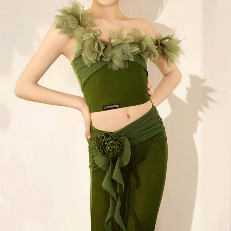 Zs舞服玫瑰印花斜肩罩衫連衣裙包臀練功服教課女成人L576