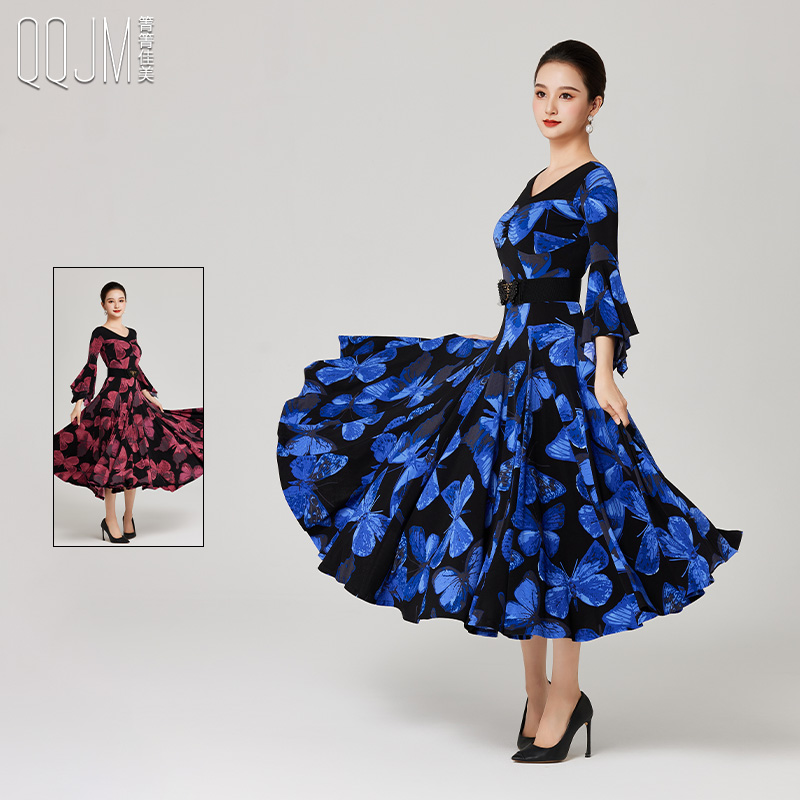 箐箐佳美新款摩登舞大擺裙荷葉袖漸變彈力連衣裙國標交誼舞演出服