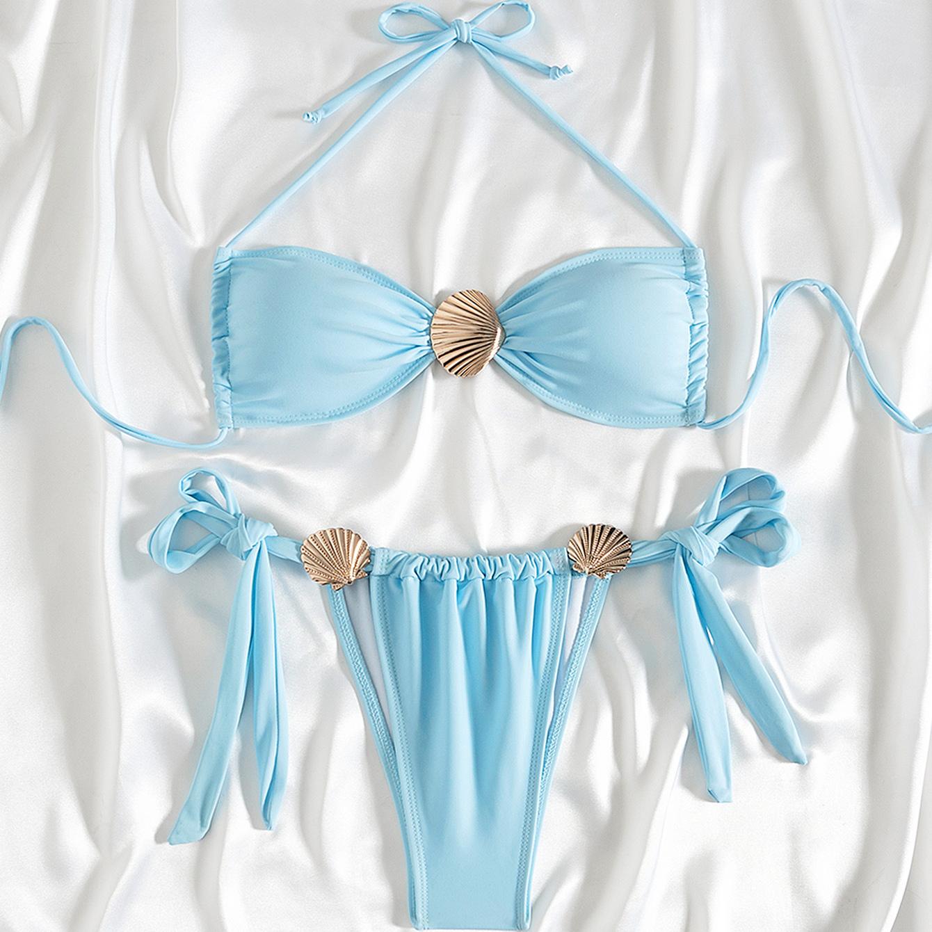 女士金屬貝殼裝飾分體掛脖bikini泳衣溫泉網紅沙灘性感系帶比基尼