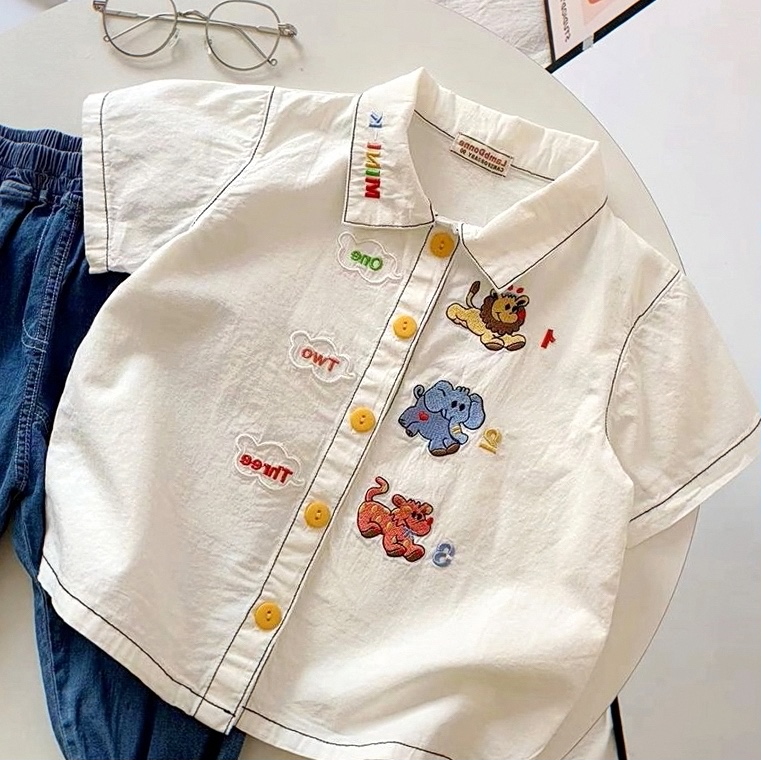 敲可愛的小刺繡白色襯衣兒童寶襯衫男童日系夏款卡通寶翻領上衣