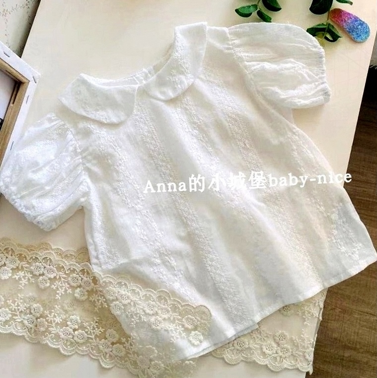 春夏童裝女娃娃衫兒童寶寶泡泡童純棉鏤空刺繡短袖袖翻領上衣薄