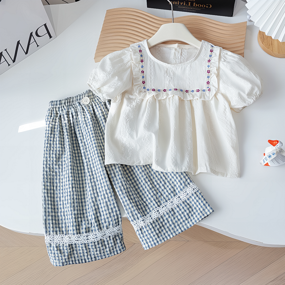款兒童韓版森系刺2025夏裝新+格子直筒闊腿褲繡娃娃衫女童套裝