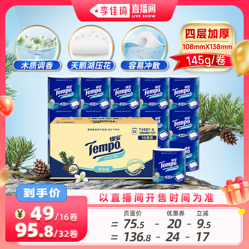 【李佳琦超級88】Tempo得寶雪松香有芯卷紙4層加厚145g家用衛生紙