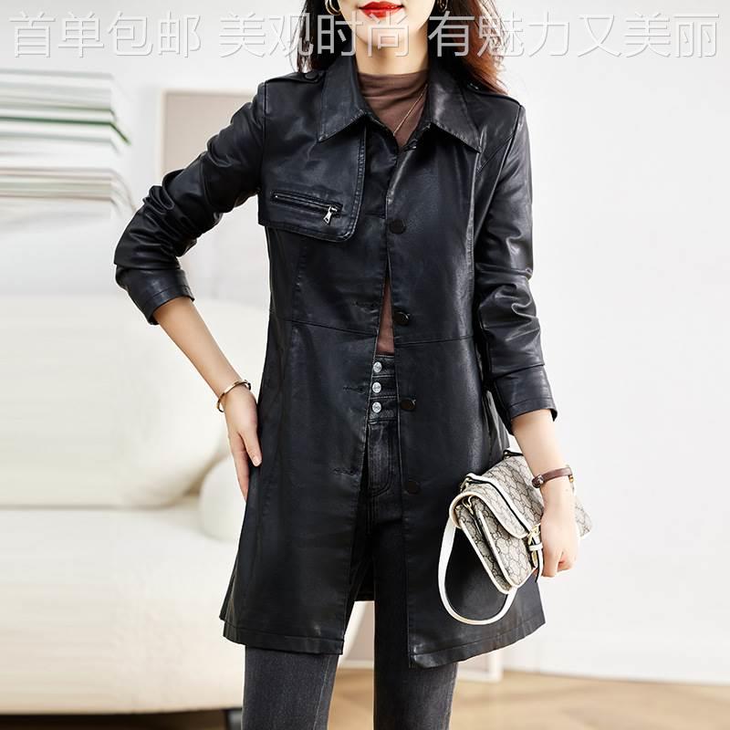 春秋季款女新時尚882735潮流氣質瘦收腰風衣式長顯款綿羊裝皮衣