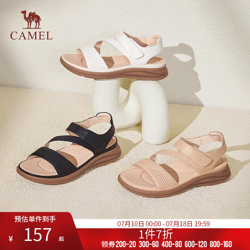駱駝女鞋2025夏季新款真皮一字帶魔術貼休閑厚底媽媽鞋羅馬涼鞋女