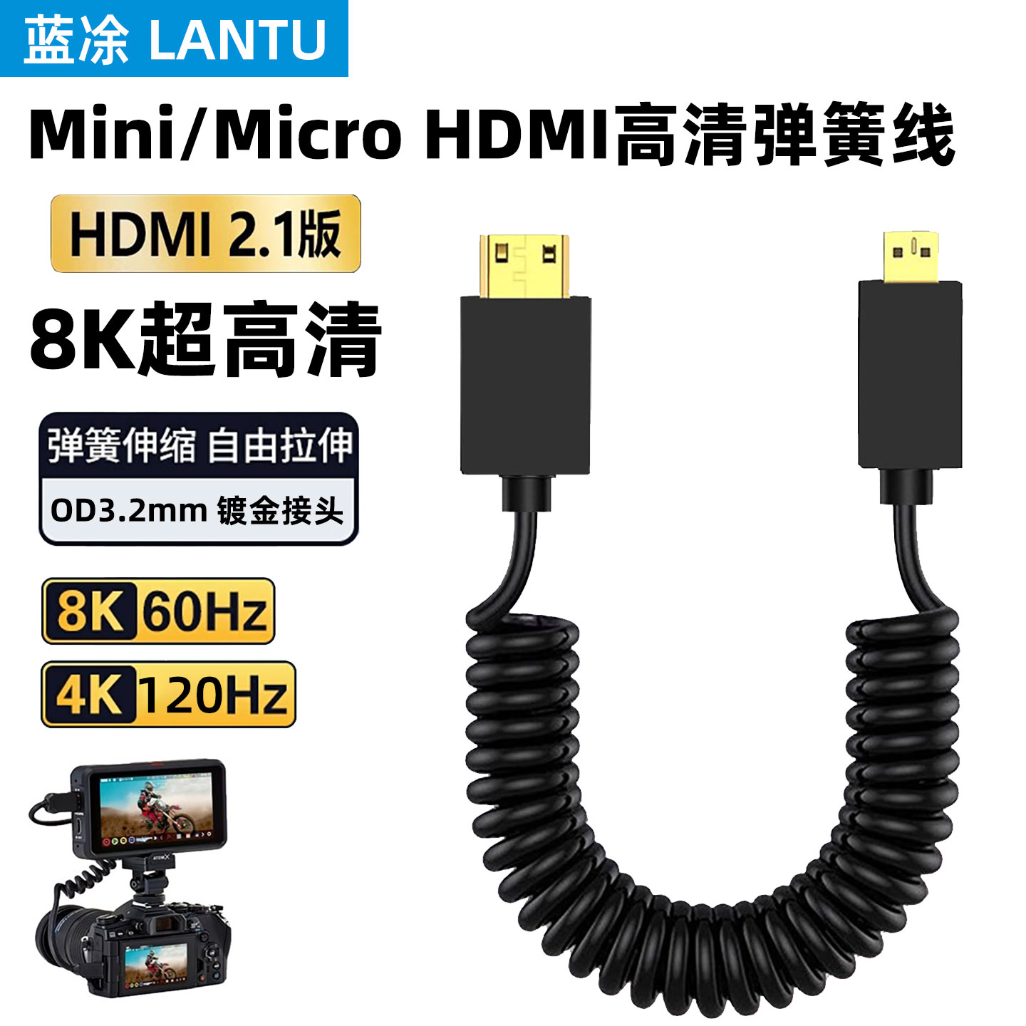 Mini HDMI細軟彈簧線彎迷你micro大小頭8K高清微單反相機接圖傳