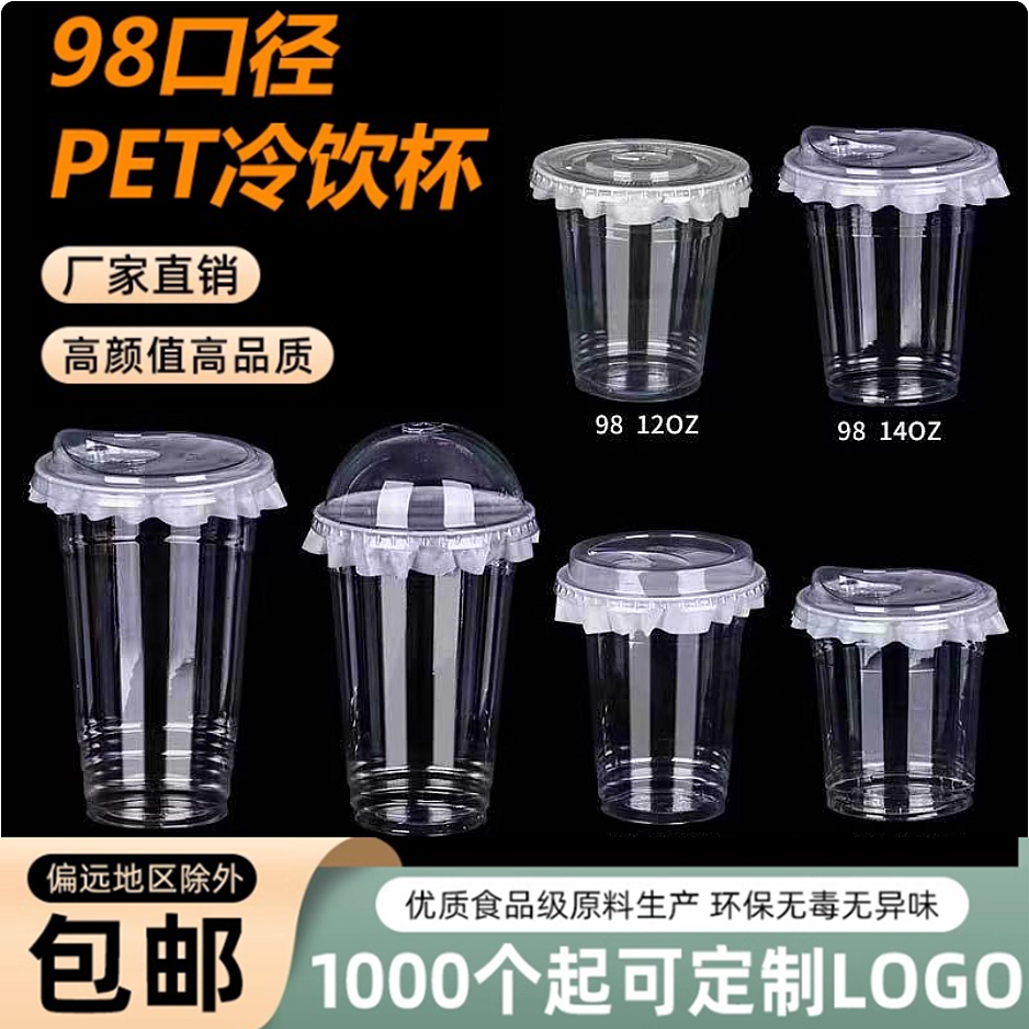 奶茶杯pet冷飲杯咖啡杯一次性商用打包塑料透明98口徑飲品杯帶蓋