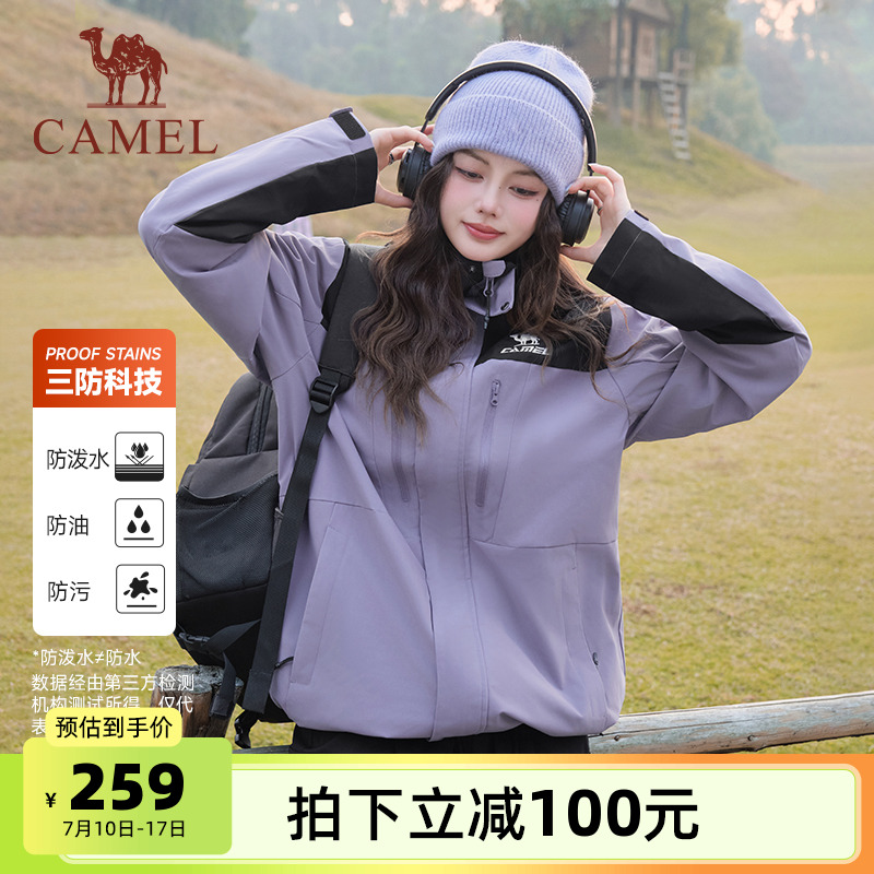 駱駝健身三防風衣外套男女款2025春季薄絨防水戶外連帽登山服夾克