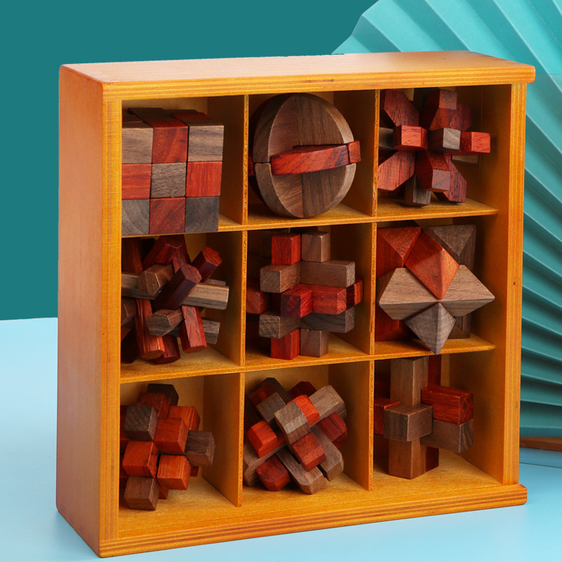 伴手禮彩盒+木盒9件套紅木孔明鎖禮品套裝魯班鎖擺攤玩具