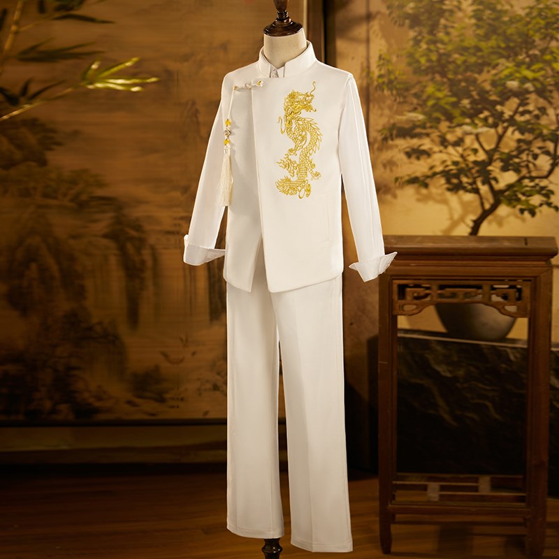 男童中式禮服白j色國潮風西裝中山裝少年主持人演講朗誦鋼琴演出