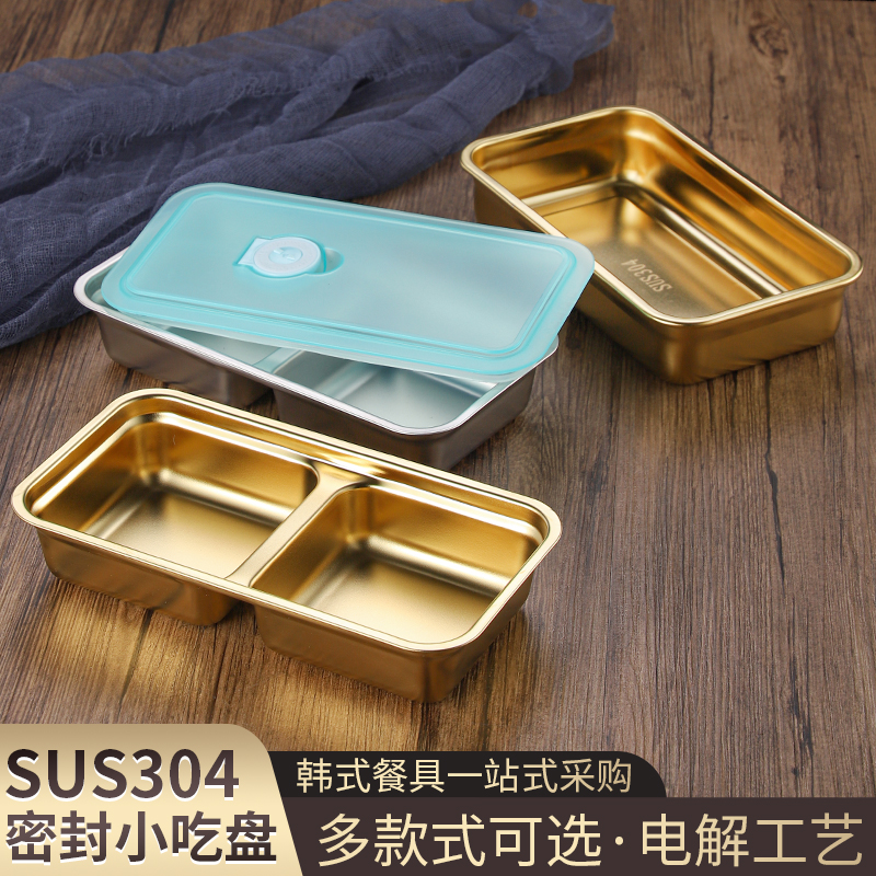 韓式304不銹鋼調料碟味碟帶蓋金色雙格醬料碟小吃盤烤肉店餐具