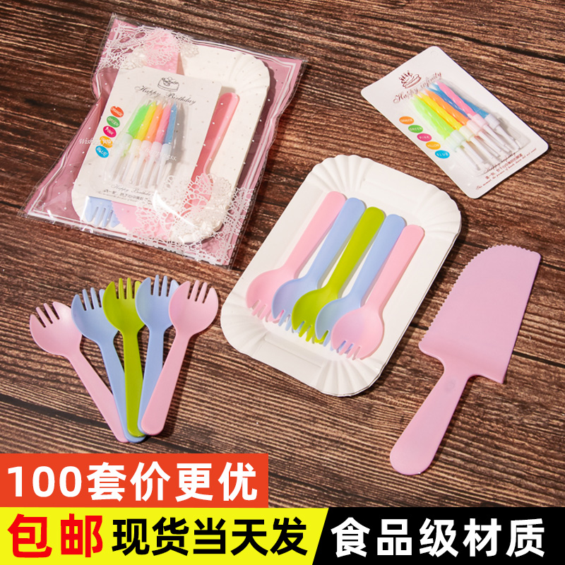 生日蛋糕刀叉盤套裝一次性餐具塑料刀叉紙盤蠟燭四合一100套