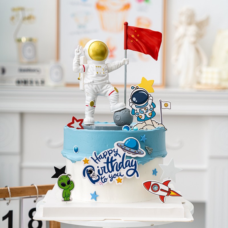 外星人勝利宇航員生日蛋糕裝飾擺件寶寶周歲星球插件航天飛機火箭