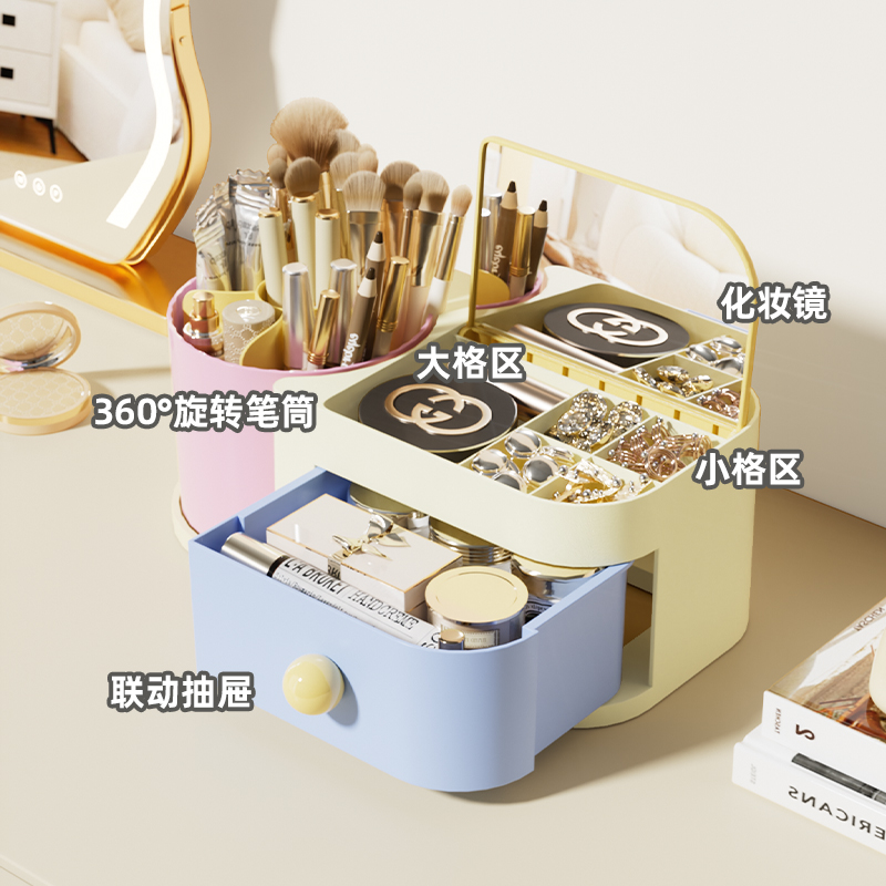 旋轉首飾盒帶鏡子學生宿舍化妝品口紅收納盒多功能桌面整理置物架