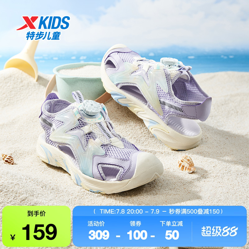 特步童鞋夏季款中大童網面透氣兒童包頭涼鞋女童旋鈕扣耐磨沙灘鞋