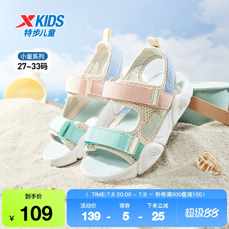 特步童鞋夏季新款小童透氣兒童戶外露趾涼鞋女童魔術貼防滑沙灘鞋