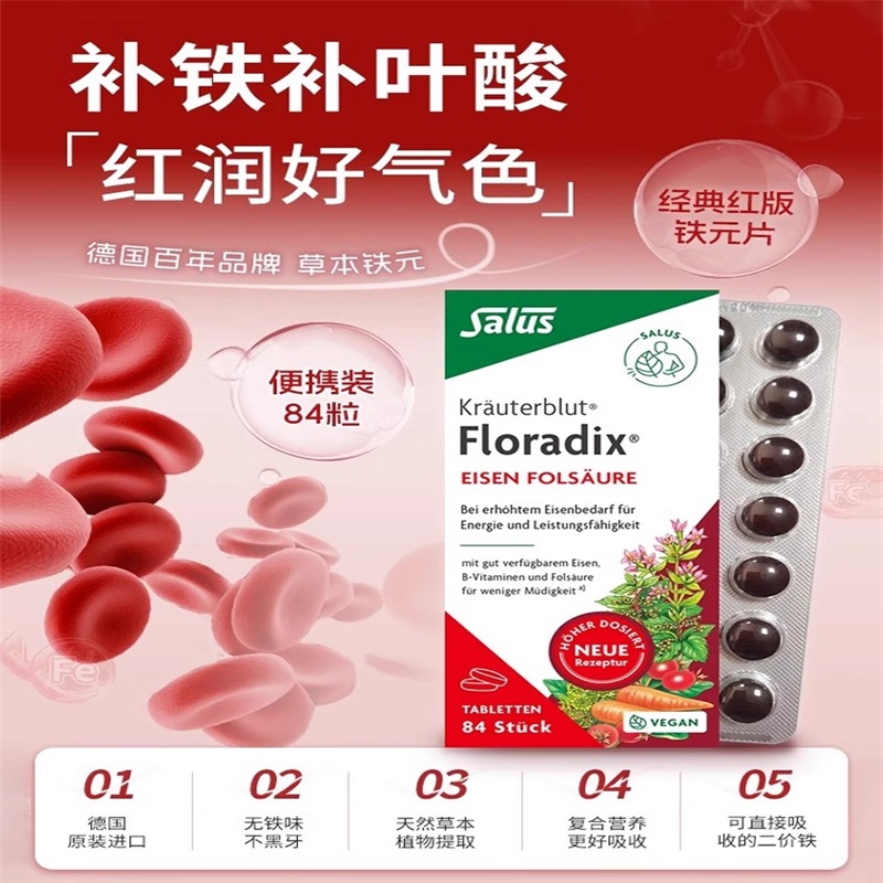 Salus莎露斯紅版鐵元片Floradix補鐵葉酸女孕婦氣血84粒德國進口
